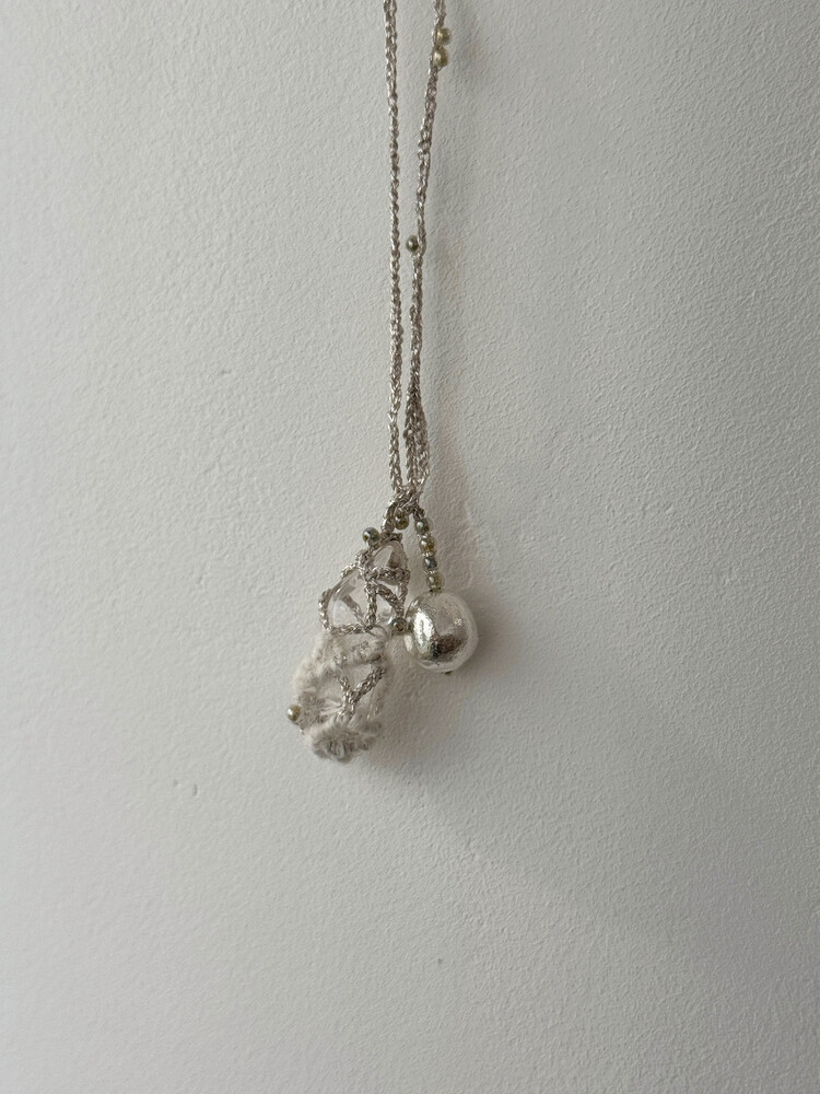 white quartz, metallic yarn, kid mohair, sterling silver, glass beads