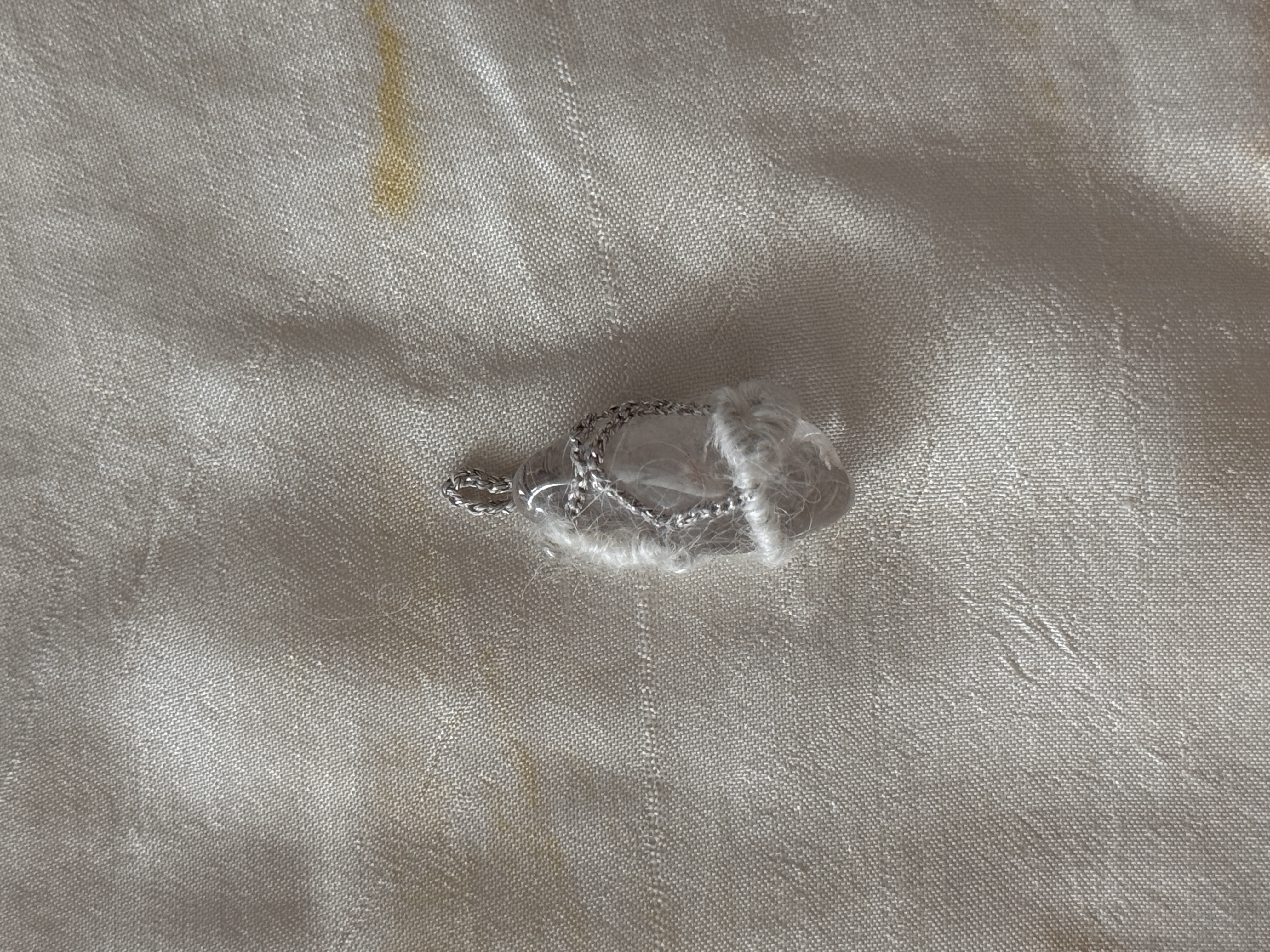 white quartz, metallic yarn, kid mohair, sterling silver, glass beads