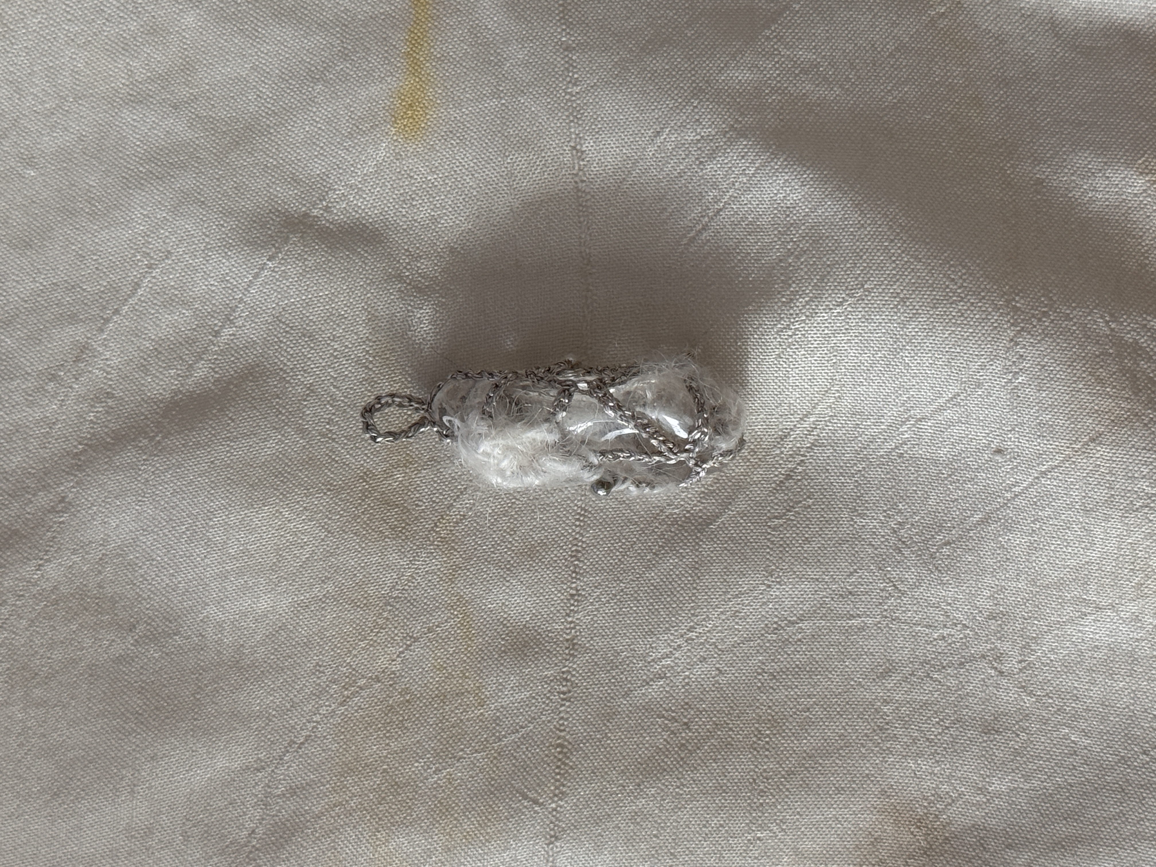 white quartz, metallic yarn, kid mohair, sterling silver, glass beads