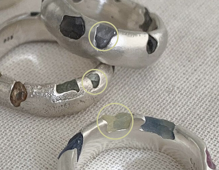 스톤 세팅 후 스톤의 컬러가 더 어둡거나 탁하게 보여질 수 있습니다. 세팅 된 스톤은 위 사진의 동그라미 표시 된 부분처럼 갈라짐이 보일 수 있습니다. 이는 천연석 특성상 스톤 내부에 기포층 혹은 결을 갖고 있어서 제작 시 고온의 열에 의해 스톤 갈라짐이 발생하는 경우이며, 이 부분은 불량이 아닌 자연스러운 디테일에 일부분인 점 확인해 주시기 바랍니다. 제품 출고 전 검수를 통해 모든 스톤이 안정적으로 세팅되었는지 확인 후 출고되니 안심하셔도 좋습니다.